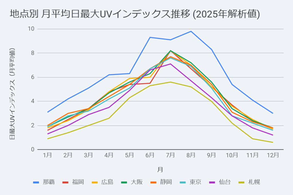 2025年の解析データによると、UVインデックス(紫外線の強さ)は3月から急激な上昇カーブを描き始めます 。